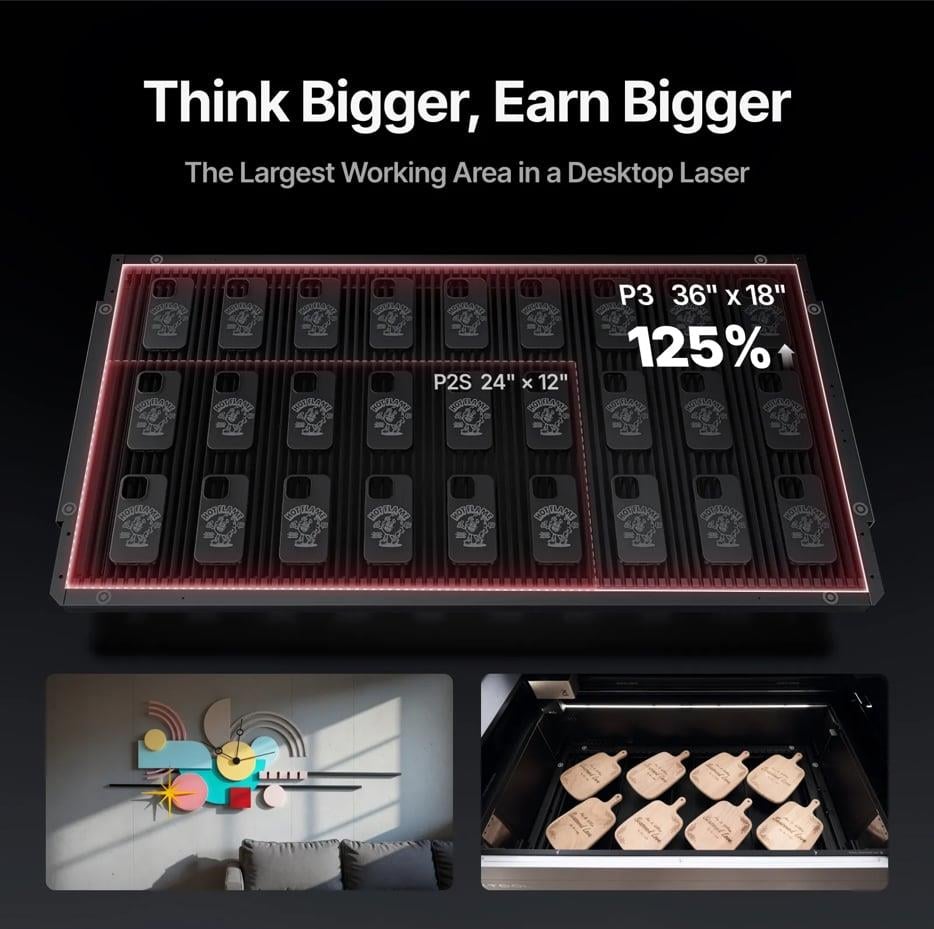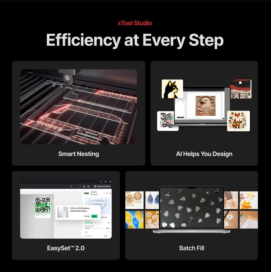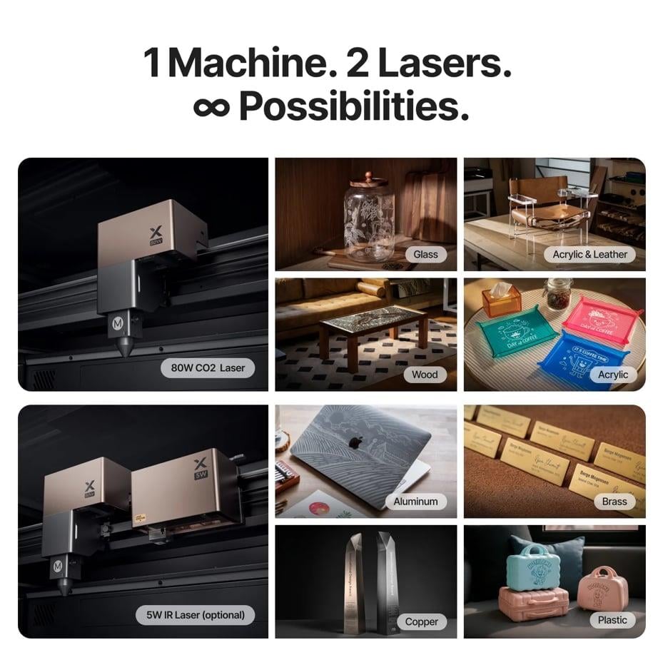 xTool'un Şimdiye Kadarki; En Güçlü, En Akıllı, En Güvenli CO2 + Infrared Lazeri 80 W CO2 lazer, diyot lazerlere göre çok daha az kömürleşme ile daha temiz ve keskin ahşap kesimleri için endüstriyel güç sağlar. 5W IR Infrared Lazer ile artık tüm metaryeller bir arada işlenebilir. Kristal berraklığındaki akrilik kesme ve kazımadan cama hassas desenler uygulamaya kadar, benzersiz dalga boyu diyot lazerlerin yapamadığı şeffaf malzemeleri ustaca işler. 20 mm kalınlığındaki ahşaptan 25 mm akriliğe ve ince kumaşlara kadar, xTool P3 hepsini işler ve kazır ! 1 Makina 2 Teknoloji ∞ Mümkün